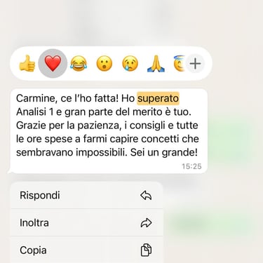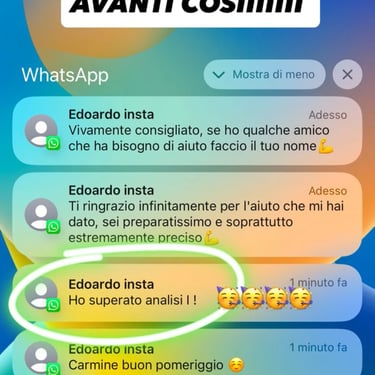 Voglio che ogni studente si senta capace, accompagnandolo nel miglioramento dei voti e dell’autostima. Attraverso Instagram e altri canali, cerco di diffondere contenuti utili e accessibili, costruendo una rete di apprendimento affidabile.